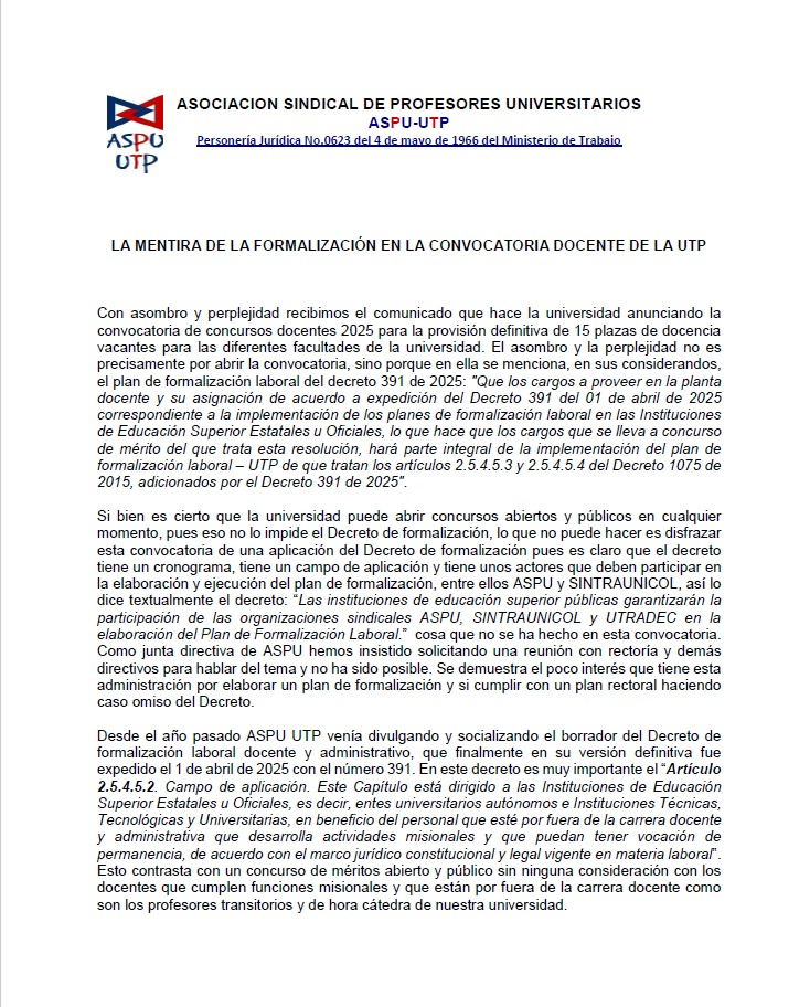 " LA MENTIRA DE LA FORMALIZACIÓN EN LA CONVOCATORIA DOCENTE DE LA UTP"