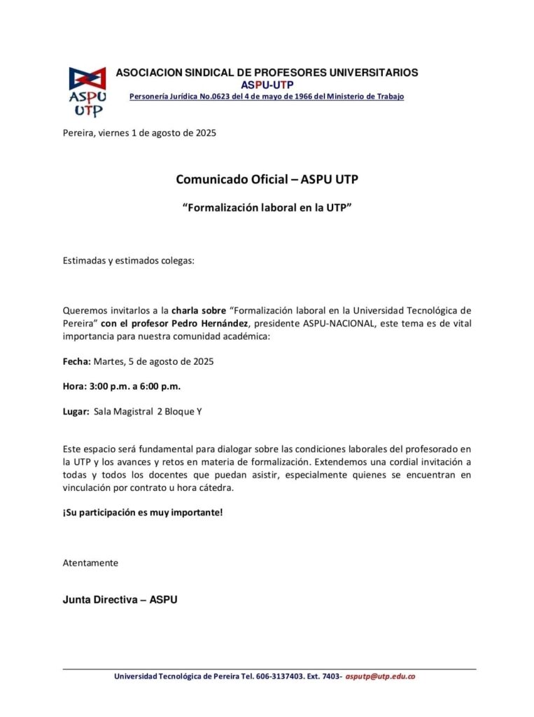 Queremos invitarlos a la charla sobre ” Formalización laboral en la Universidad Tecnológica de Pereira” con el profesor Pedro Hernández, presidente de ASPU-NACIONAL.